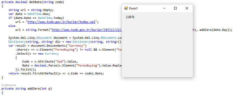 Daha sonra formun kod bölümüne geçin ve aşağıdaki GetRate() fonksiyonu ekleyin. Bu fonksiyon gördüğünüz gibi “Türkiye Cumhuriyeti Merkez Bankası” üzerinden istenilen para biriminin değerini decimal değerinde geriye döndürüyor.